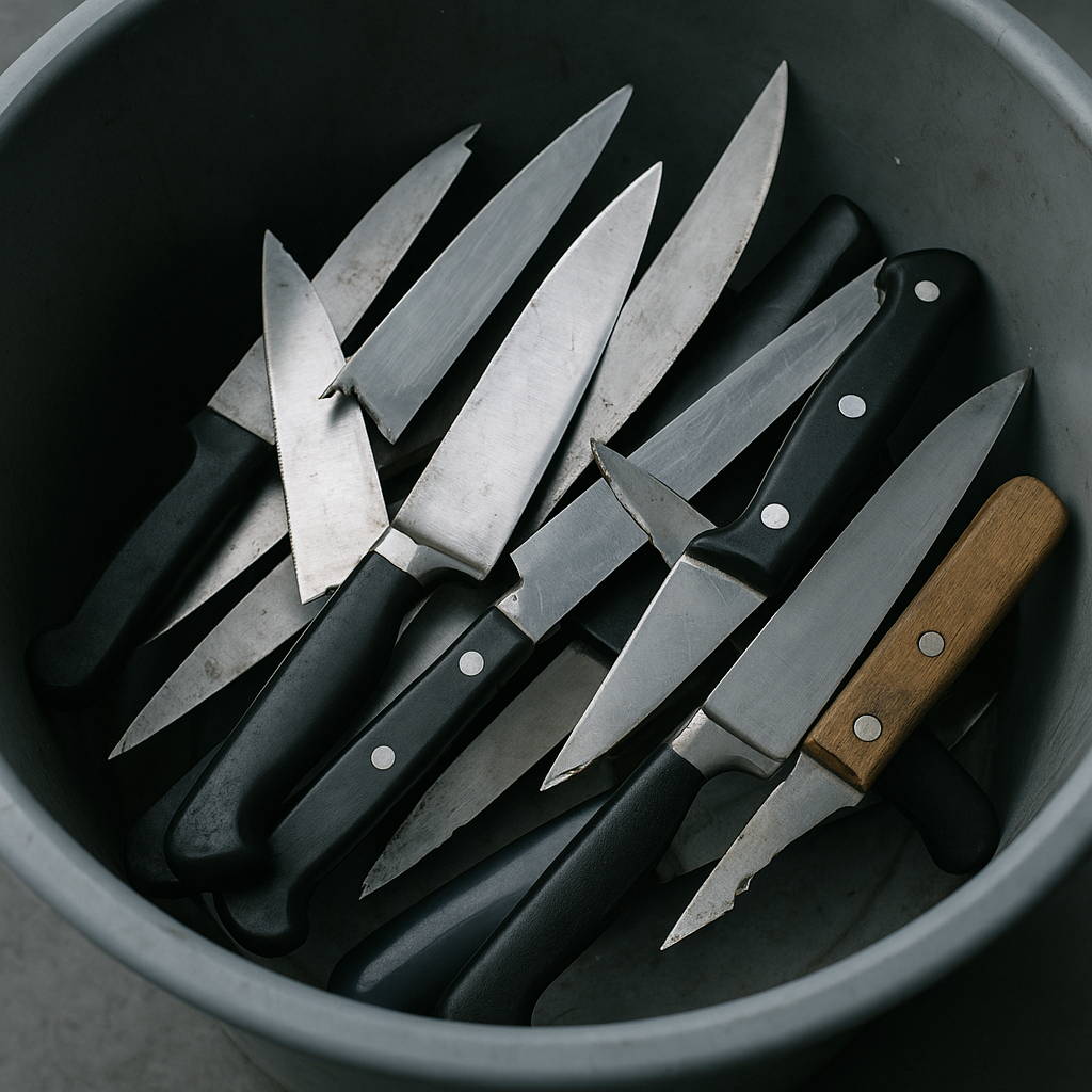 Faded, worn handles. Dull sharpness, Chipped, or snapped blades.